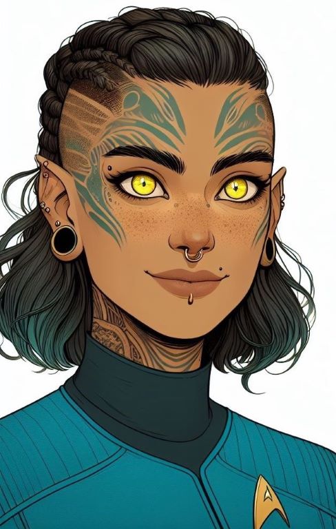 | Strengths & Weaknesses | Telepathic Abilities || Atarangi has two powerful telepathic bloodlines coursing through her veins, though neither manifest as straightforwardly as, say, a Betazed’s empathy might. However, through training, she has become attuned to those abilities. As an Oran’Taku, she can sense emotions like Betazoids. However, they are primarily known for their ability to weaken the minds of others, causing a sort of mesmerization or hypnosis and even short-term memory loss. Cygnian telepathic abilities allow them to detect the actions of others within a short range. Telepathic Limitations || Oran’Taku physiology limits her telepathic abilities to skin-to-skin contact with the target. That contact must also be against live nerves—or it does not work. She cannot sense emotions from a distance or use her other telepathic abilities. Her Cygnian telepathy has a better range but is still limited to being within a meter or so of a person. Bioluminescent Scan || One strange aspect of her Oran’Taku heritage is that her telepathic abilities require touch (see below), but in doing so, they cause a connection of nerves. When connected, she can cause a creature's natural bioluminescence to rise, allowing her to visually scan a creature's nervous system. This ability is limited in its use cases and is only helpful in medical situations. It is, however, also a fascinating party trick. Complex Retinal Structure || Oran’Taku have a complex retinal structure, letting them see an incredible variety of wavelengths of light. Cygnians are known for their large, catlike eyes. The two seem to have provided her with a powerful and precise vision spectrum when paired. Her natural night vision is exceptional. Cybernetics || Her cybernetics are limited and mostly for prosthesis purposes. They don’t provide many benefits but could theoretically be augmented. Hybrid Biology || Hybrids have a number of issues that others don’t expect. They tend to have odd reactions to medications, odd immune systems, and unexpected quirks that crop up as they age. Atarangi is no different. Specialist || She is a specialist. If you need a doctor in an emergency, a pararescue operator, or a singer, she’s your girl. Beyond that, she’ll have to write you a referral. Traumatic Background || Atarangi came into life traumatically, and while she’s been able to find peace in some places - plenty of traumas followed. She vividly remembers the Dominion Wars, the hushed waiting for any word from their father, the attack on Earth by the Borg, by the Breen, and just the general life of a emergency/trauma specialist in the medical field. |